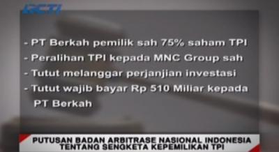 Sengketa kepemilikan TPI berakhir dengan keluarnya putusan Badan Arbitrase Nasional Indonesia (BANI).