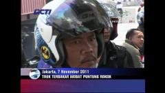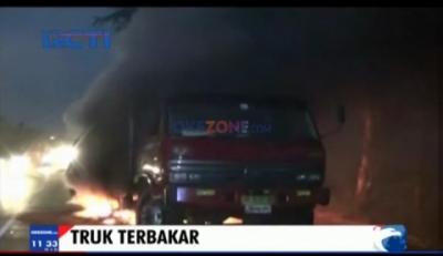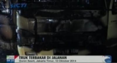 Sebuah truk tronton yang membawa makanana ringan terbakar di Pasar Rebo, Jakarta Timur.