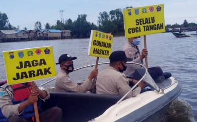 Naik Sampan, Anggota Polsek Aluh-Aluh Susuri Sungai Barito Sosialisasi Protokol Kesehatan