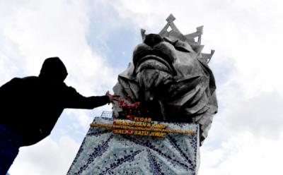 Aksi Bakar Lilin di Depan Patung Singa Stadion Kanjuruhan