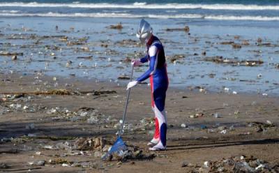 Ultraman Pakai Sendal Jepit Bersihkan Sampah Pantai Kuta Bali