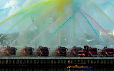 Petugas Damkar Semprotkan Air Warna-Warni di HUT Kota Makassar