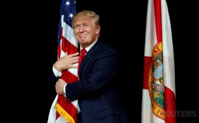 Donald Trump Peluk Bendera AS saat Kampanye di Florida