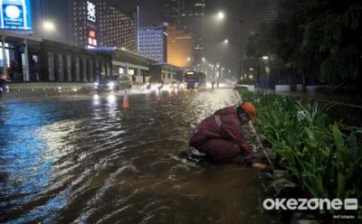 Pasukan Biru dan Kuning Gotong-Royong Tangani Banjir Jalan Medan Merdeka Barat