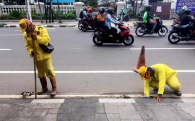 Petugas PPSU dan Pasukan Biru Perbaikan Drainase Tersumbat di Bundaran HI