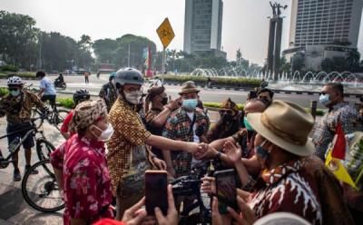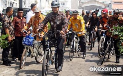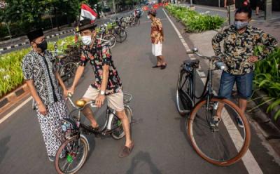 Anies Baswedan Gowes Pakai Batik di Bundaran Hotel Indonesia