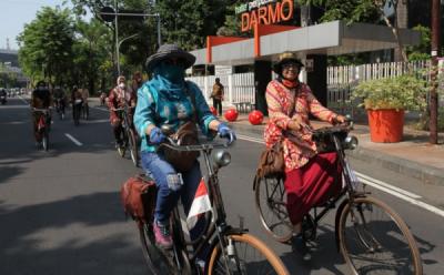 Aksi Ibu-Ibu Bersepeda Keliling Kota Surabaya Sambil Kenakan Busana Batik