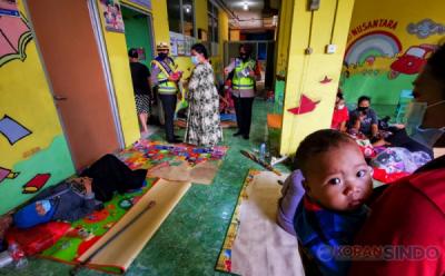 Cegah Penyebaran Covid-19, Polwan Bagikan Masker Korban Banjir di Lokasi Pengungsian