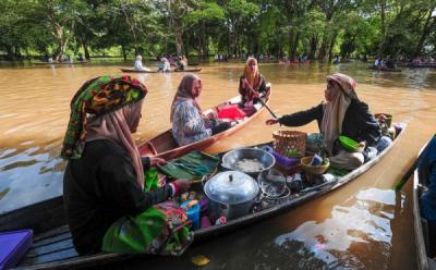 Kawasan Situs Candi Astano Terendam Banjir Dimanfaatkan Warga untuk Wisata Pasar Apung