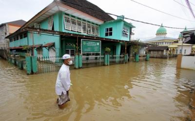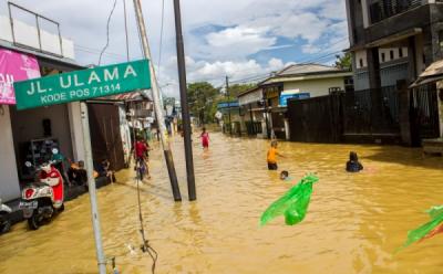 Warga Melintasi Banjir yang Merendam Desa Pagar Ulu Banjar Kalimantan