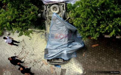 Truk Kontainer Terbalik Usai Alami Kecelakaan dengan Mobil Pribadi