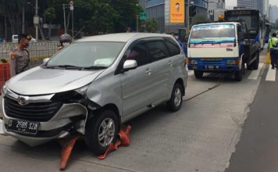 Mobil Tersangkut Separator Busway di Depan Samsat Jakarta Timur