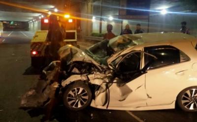 Tabrak Pembatas Jalan, Mobil Putih Ini Ringsek