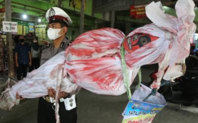 Bawa Boneka Pocong, Anggota Polisi Polres Kediri Sosialisasi Prokes di Pasar Bandar Kediri