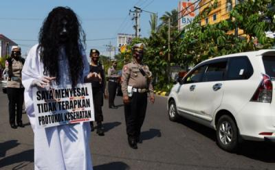Berkostum Horor, Personel Polres Madiun Sosialisasi Protokol Kesehatan di Kawasan Objek Wisata