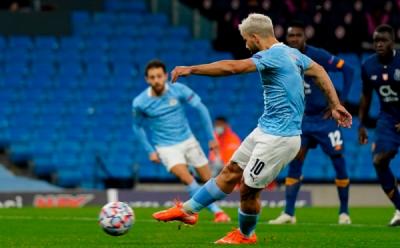 Selebrasi Sergio Aguero Usai Cetak Gol ke Gawang Porto