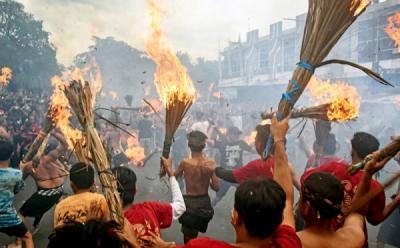 Keseruan Perang Api Jelang Perayaan Nyepi di Mataram NTB