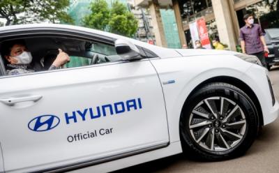 Menteri Airlangga Hartarto Jajal Mobil Listrik Operasional Presidensi G20 2022 di Halaman Kantor Kemenko Perekonomian