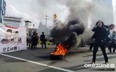 Aksi Mahasiswa Bakar Ban di Patung Kuda