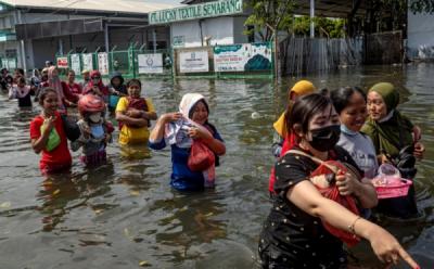 Karyawan Terpaksa Melintasi Banjir Rob yang Menggenangi Kawasan Industri Pelabuhan Semarang