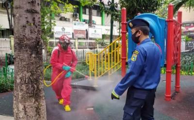 Petugas Damkar Semprotkan Disinfektan di RPTRA Matoa