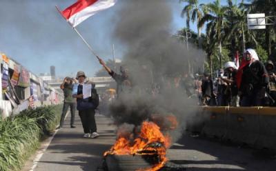 Demo di Depan Gedung KPU, Massa Bakar Ban Bekas Tolak Kecurangan Pemilu