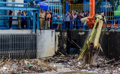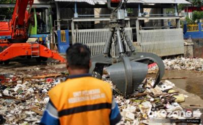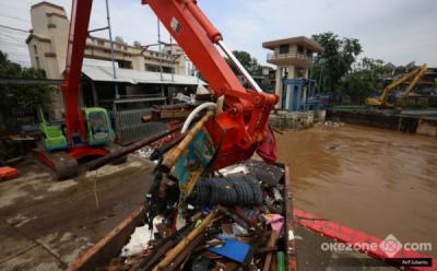 Melihat Alat Berat Mengangkat Tumpukan Sampah di Pintu Air Manggarai