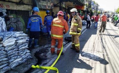 Pasukan Gabungan Bersihkan dan Penyemprotan Saluran Air di Jalan Raya Bogor