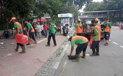 PPSU Bersihkan Sampah Sisa Aksi Tolak UU Cipta Kerja di Patung Kuda