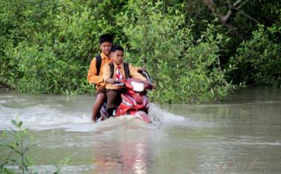 Potret Pelajar Menggunakan Sepeda Motor Terobos Banjir