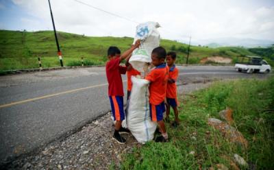 Senyum Anak-Anak SD Bersihkan Sampah Plastik di Jalan Raya Trans Flores