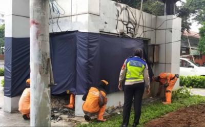 Pos Polisi Menteng yang Rusak Ditutup Kain