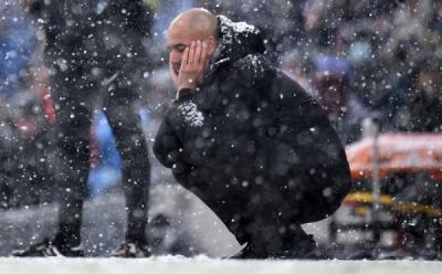 Momen Pep Gurdiola Jongkok Kedinginan saat Salju Turun Dilaga Man City vs West Ham United