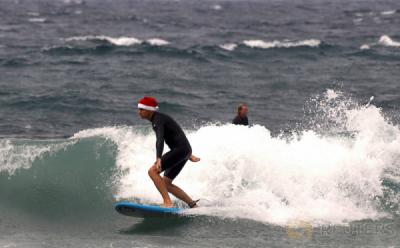 Bermain Papan Selancar saat Perayaan Natal di Pantai Bondi Australia