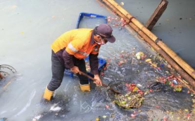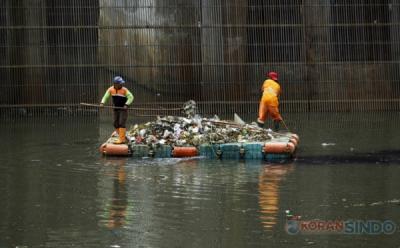 Antisipasi Banjir Akhir Tahun, Pekerja Bersihkan Sampah Pintu Air Sunda Kelapa
