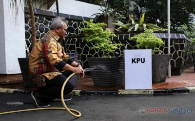Ketua KPU Arief Budiman Menduduki Kotak Suara Kardus yang Menjadi Polemik