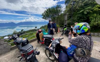 Pemudik Menikmati Pemandangan Danau Maninjau di Agam Sumatera Barat