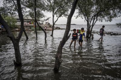 Warga Beraktivitas di Genangan Banjir Rob Muara Angke Jakarta