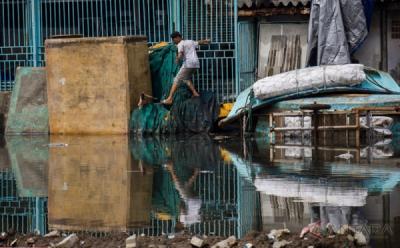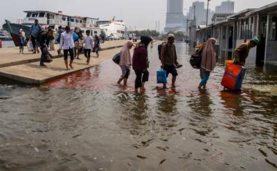 Kawasan Muara Baru Terendam Banjir Rob, Aktivitas Warga Berjalan Seperti Biasa