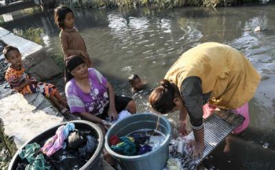 Warga Bekasi Mencuci Pakaian di Aliran Sungai yang Keruh