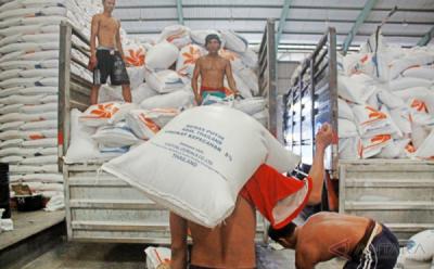 Melihat Aktivitas Pekerja Mengangkut Beras Impor dari Thailand di Gudang Bulog Sidoarjo