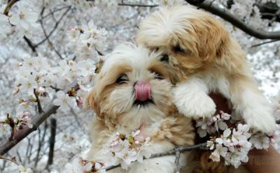 Lucunya Anjing Kembar Ini di Antara Mekarnya Bunga Sakura