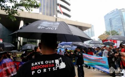 Kenakan Payung Hitam, Puluhan Pekerja Pelabuhan Geruduk KPK