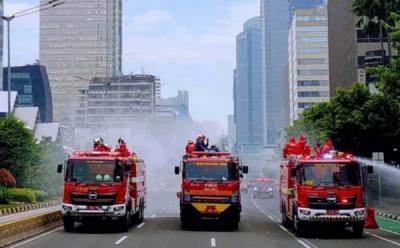 Petugas Damkar Semprotkan Disinfektan di Jalan MH Thamrin
