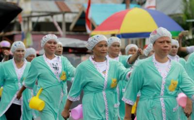 Gunakan Pakaian Mandi Sejumlah Ibu-ibu Ikuti Gerak Jalan Bersama