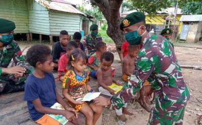 Satgas Yonif MR 411 Kostrad Bagikan Buku Bacaan kepada Anak-Anak Perbatasan