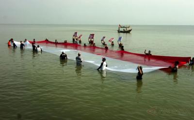 Nelayan Bentangkan Bendera Merah Putih Raksasa di Pantai Utara