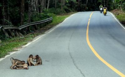 Sejumlah Beruk Memasuki Jalan Perlintasan Ibu Kota Negara Nusantara