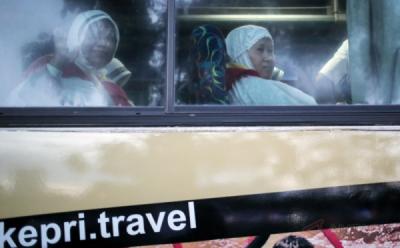 Dari Balik Kaca Bus Calhaj Kloter I Embarkasi Batam Lambaikan Tangan kepada Keluarga