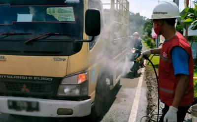 Relawan Semprot Disinfektan Kendaraan yang Melintasi Perbatasan Banjarnegara-Pekalongan
